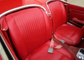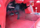 The cabin features bucket seats upholstered in red vinyl with channeled inserts joined by a color-keyed dashboard, door panels, sun visors, and carpets. Features include a dash-mounted rearview mirror, lap belts, an analog clock, polished sill plates, and a Wonder Bar push-button radio.