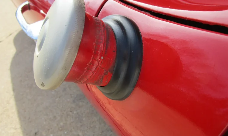 The fiberglass body is said to have been refinished in red during previous ownership. Features include a body-colored removable hardtop, left-side mirror, protruding fuel filler neck, color-keyed coves, quad headlights, split chrome bumpers, polished trim, and a fender-mounted antenna.