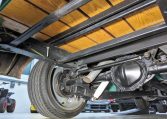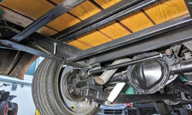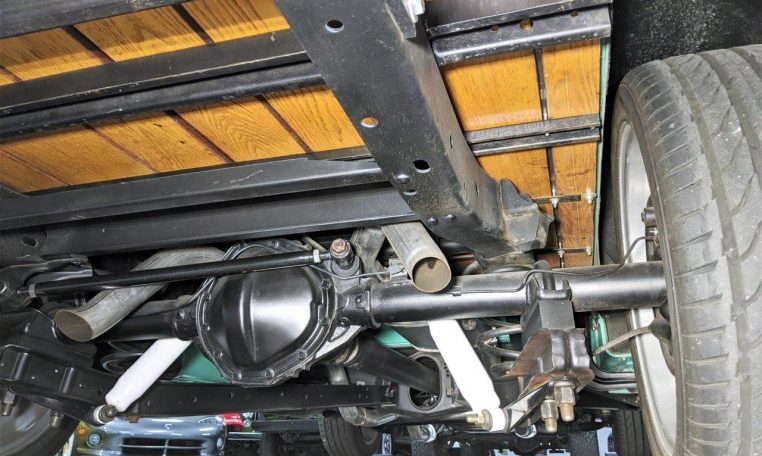 Power is routed to the rear wheels via a 700R4 four-speed automatic overdrive transmission and a 12-bolt rear end. Additional photos showing the suspension, chassis, and wood bed are presented in the gallery.