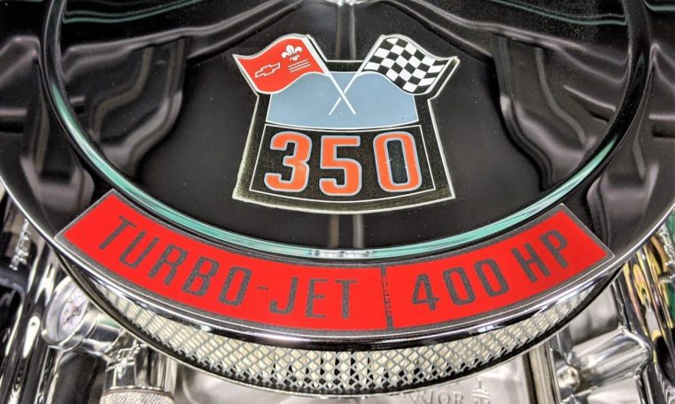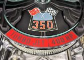 The 350ci V8 Stage 3 crate engine was supplied by ATK High Performance Engines and replaces the factory inline-six. The engine features a Weiand Speed Warrior aluminum intake manifold, a Quick Fuel 680cfm carburetor, a Holley fuel pump, an HEI distributor, and exhaust headers connected to a custom dual exhaust. The oil was changed less than 350 miles ago.
