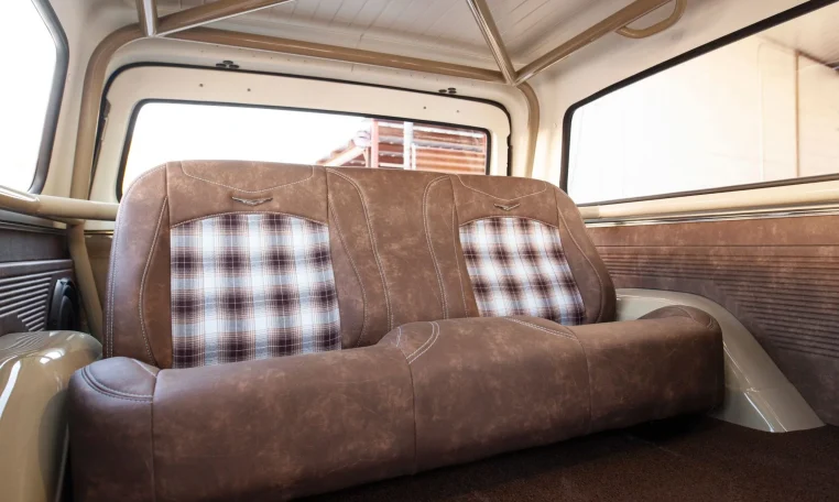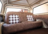 This example was refinished in Toyota Quicksand over Mercedes-Benz Cirrus White paint following bodywork at the seller’s shop, and its fiberglass hardtop was refurbished with new gel coat in factory-style satin white as well as replacement glass and a gas strut upgrade. Exterior details include a stock grille as well as truck-style chrome trim along the wheel arches and rocker panels. A color-matched, TIG-welded custom roll cage was also fitted.