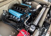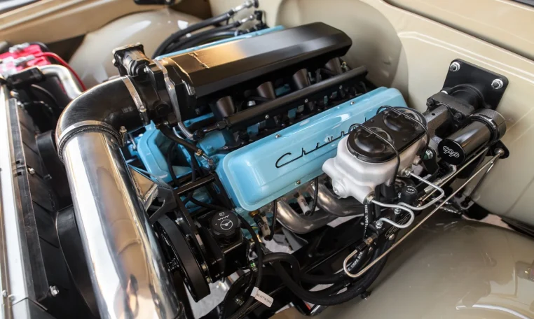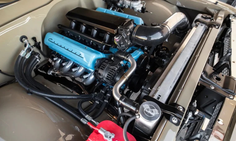 The LS-based 6.0-liter V8 features a Holley EFI high-rise intake manifold, ceramic-coated Hedman exhaust headers, black ICT pulleys, and a Dirty Dingo ECU mount. Additional equipment includes a set of vintage-style coil pack covers and a DeWitts aluminum radiator with stainless steel and silicone hoses.