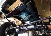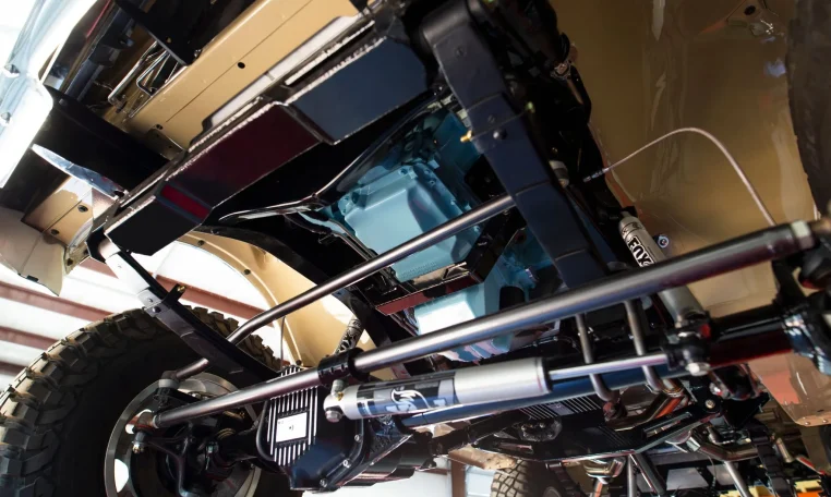 Power is sent to the rear, front, or all four wheels through a 4L80E automatic transmission and an Atlas twin-stick transfer case. Additional underbody components include a 24-gallon Boyd Welding aluminum fuel cell on a custom mount, a Mag-Hytec transmission pan and differential covers, and a custom polished stainless steel dual exhaust system with MagnaFlow mufflers.