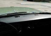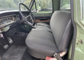 The bench seat is upholstered in black cloth with vinyl sides, while the exposed metal surfaces are finished in green. Black carpets line the floorboards, and further elements include faux woodgrain trim, a heater, and manual crank windows.