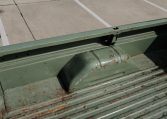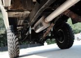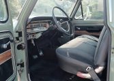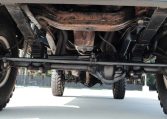 White-finished 16″ steel wheels with polished covers are mounted with 9.00-series Power King Premium Traction tires. Mile Marker manually locking front hubs have been fitted along with Bilstein shock absorbers with remote reservoirs up front. The steering stabilizer was reportedly replaced and the four-wheel drum brakes were rebuilt