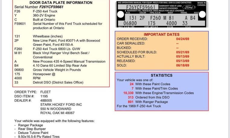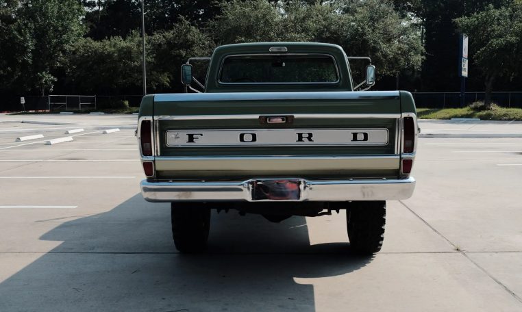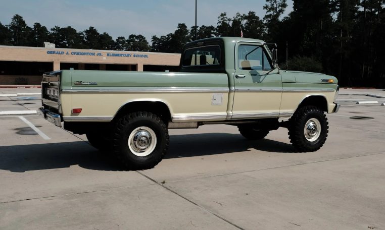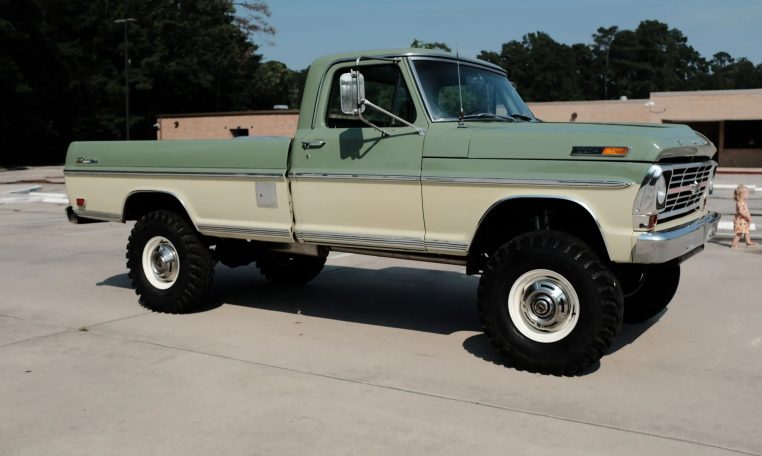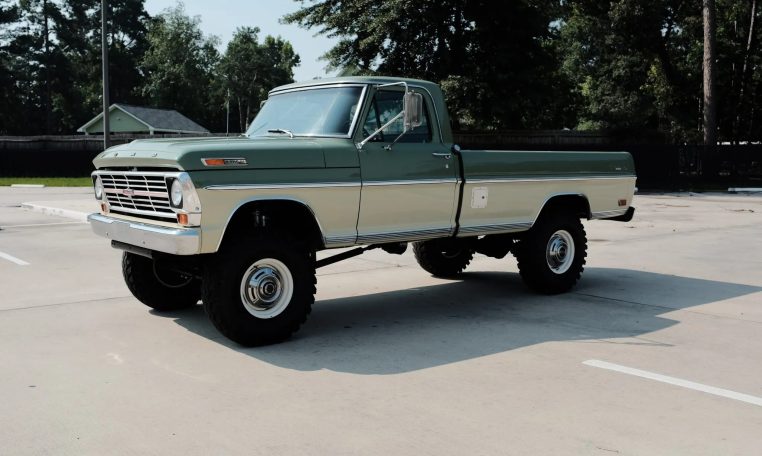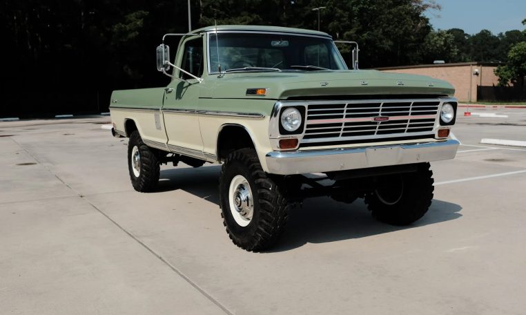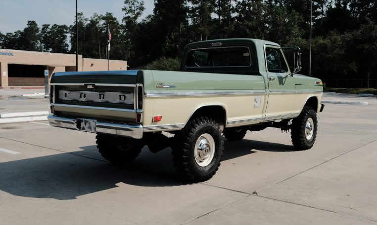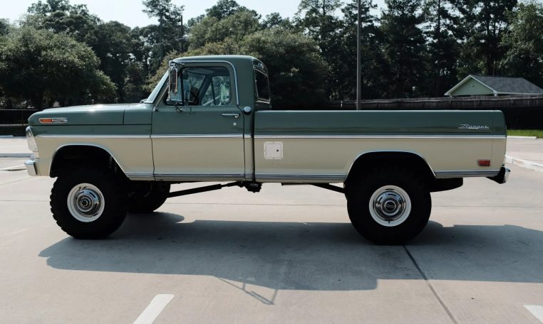 No Taxes & LicensingThis 1969 Ford F-250 Ranger is a 4×4 pickup that is powered by a 360ci V8 linked with a four-speed manual transmission, a divorced dual-range transfer case, and a limited-slip Dana 60 rear differential. Finished in two-tone green, the truck is further equipped with 16″ steel wheels, Mile Marker manually locking front hubs, and Bilstein shock absorbers in addition to black interior upholstery, a heater, long-tube exhaust headers, and a MagnaFlow muffler