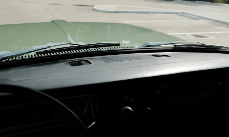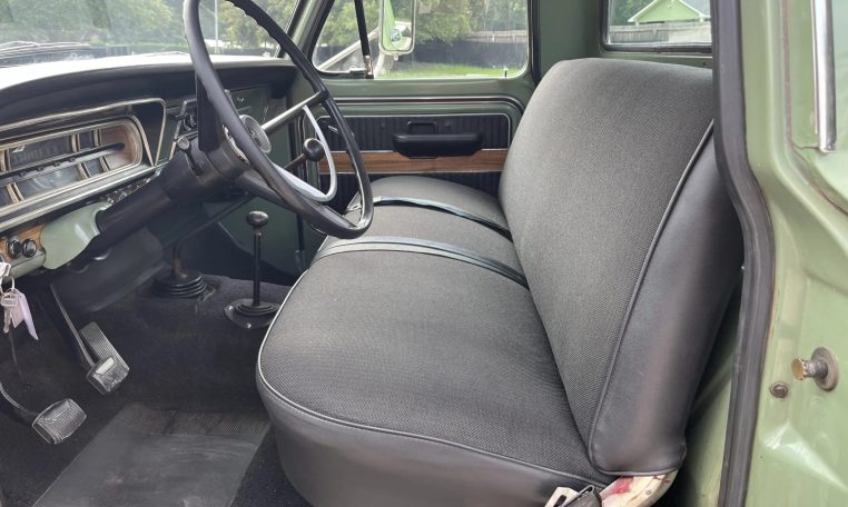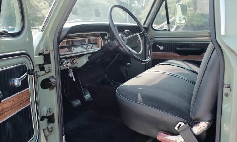 The bench seat is upholstered in black cloth with vinyl sides, while the exposed metal surfaces are finished in green. Black carpets line the floorboards, and further elements include faux woodgrain trim, a heater, and manual crank windows.