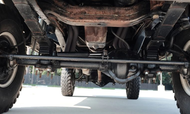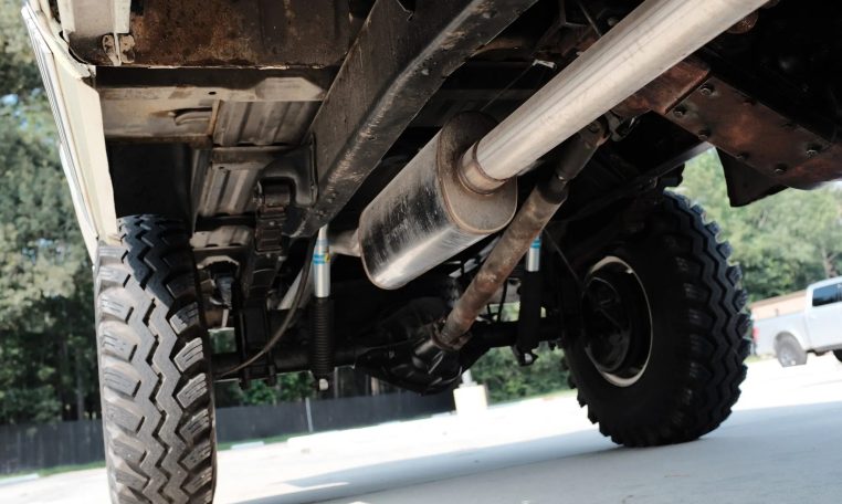 White-finished 16″ steel wheels with polished covers are mounted with 9.00-series Power King Premium Traction tires. Mile Marker manually locking front hubs have been fitted along with Bilstein shock absorbers with remote reservoirs up front. The steering stabilizer was reportedly replaced and the four-wheel drum brakes were rebuilt
