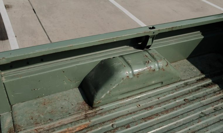 Finished from the factory in two-tone Boxwood Green and New Lime Paint, the truck was reportedly repainted under prior ownership. Details include a Styleside bed, locking fuel filler doors, polished bodyside trim, and chrome-finished bumpers. Rust, dents, and scratches are noted on the bed floor.