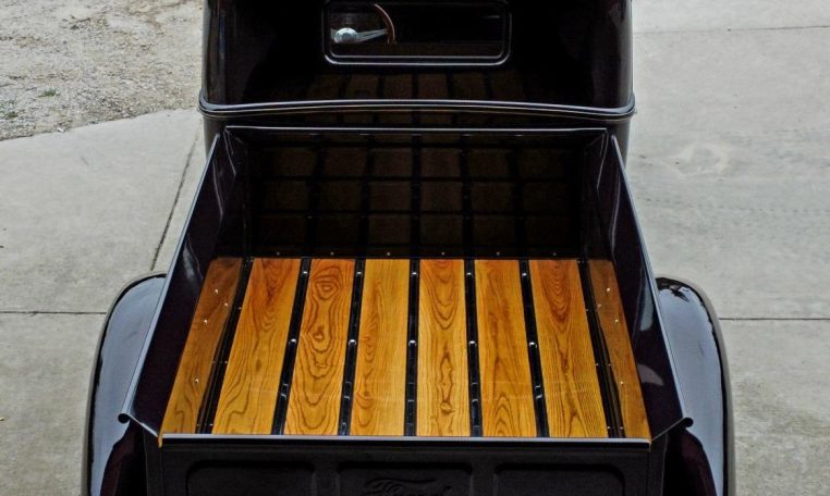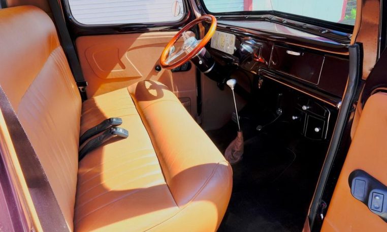 The body is finished in Dark Cherry Metallic over brown leather upholstery, and equipment includes a three-speed automatic transmission, a wood bed floor, body-colored running boards, dual chrome side mirrors, and 15″ Weld Racing Rodlite wheels in addition to a Lokar floor shifter, shoulder belts, and power windows.