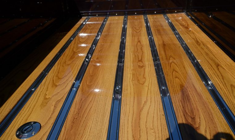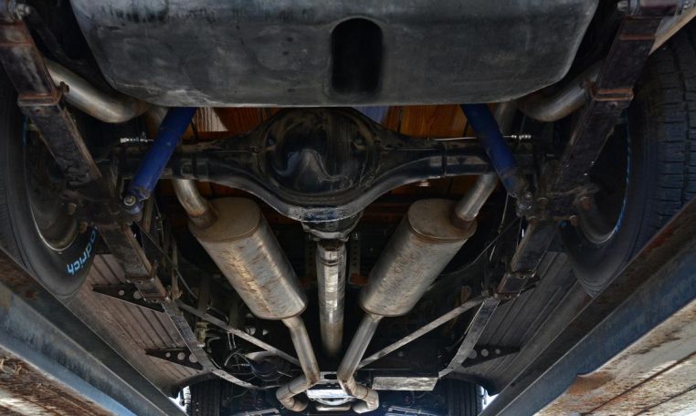 Power is sent to the rear wheels through a GM TH350 three-speed automatic transmission and a B&M torque converter linked to a narrowed Ford9″ rear end with a 3.50:1 limited-slip differential. Other updates include a 15-gallon polyethylene fuel tank and a Holley fuel pump.
