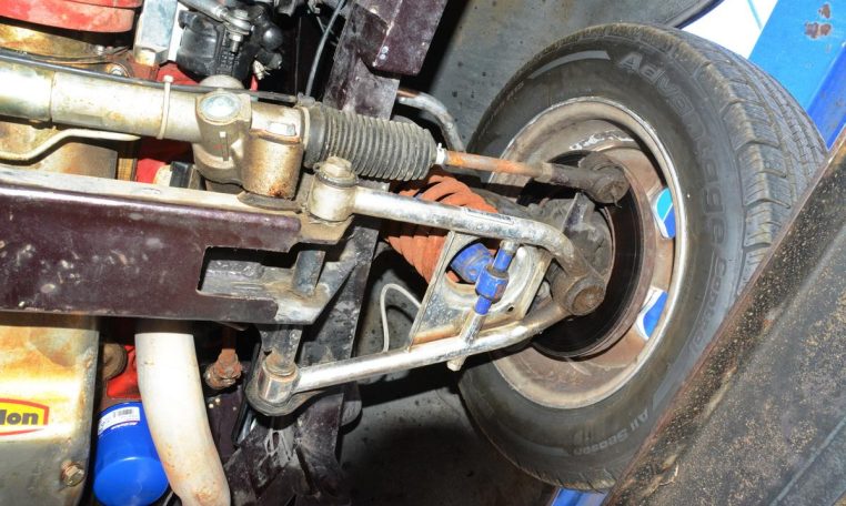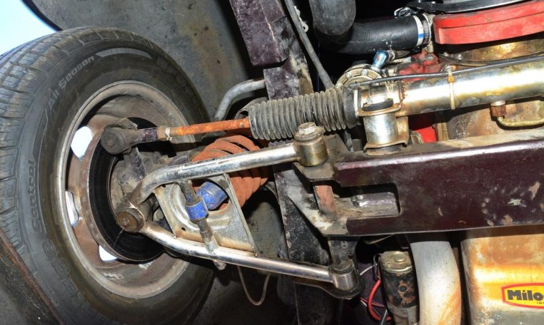 Polished 15″ Weld Racing Rodlite wheels are wrapped in 195/65 front and 255/70 rear BFGoodrich tires. A Heidts Mustang II-style independent front suspension system and steering rack are installed, and braking is handled by power-assisted front discs and rear drums.